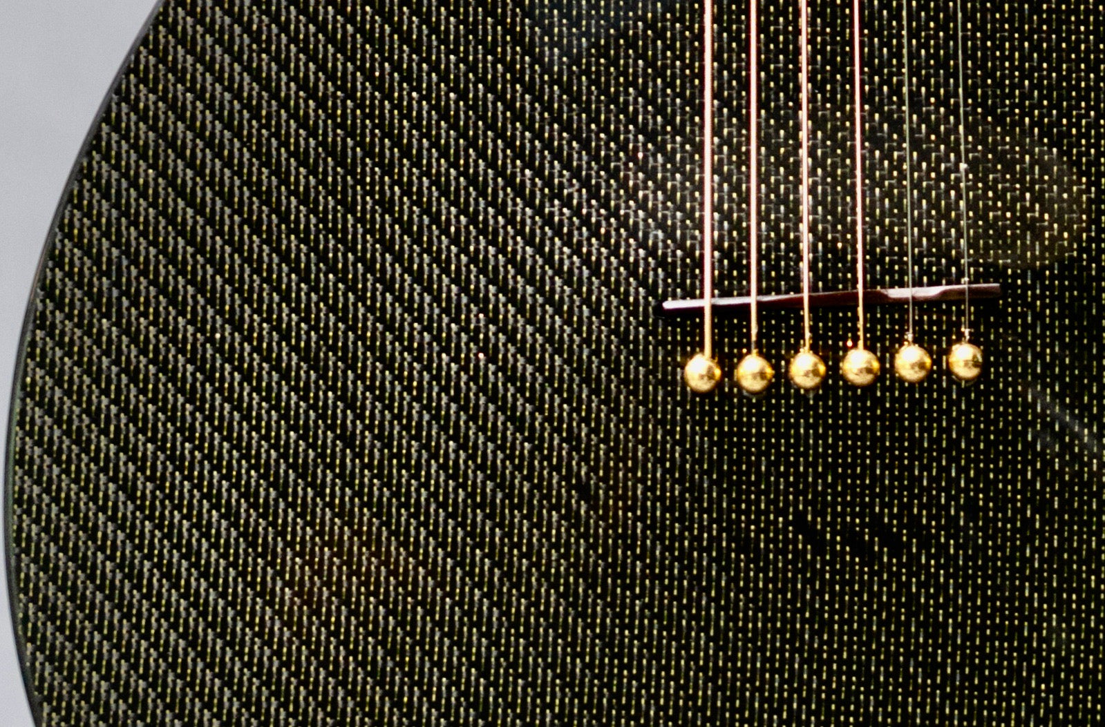 Black with rich gold metallic weave. Light/movement changes the Black to catch Gold reflections. Gold frets, tuners, pins.